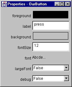 Here is the BeanBox's Properties sheet containing OurButton properties: